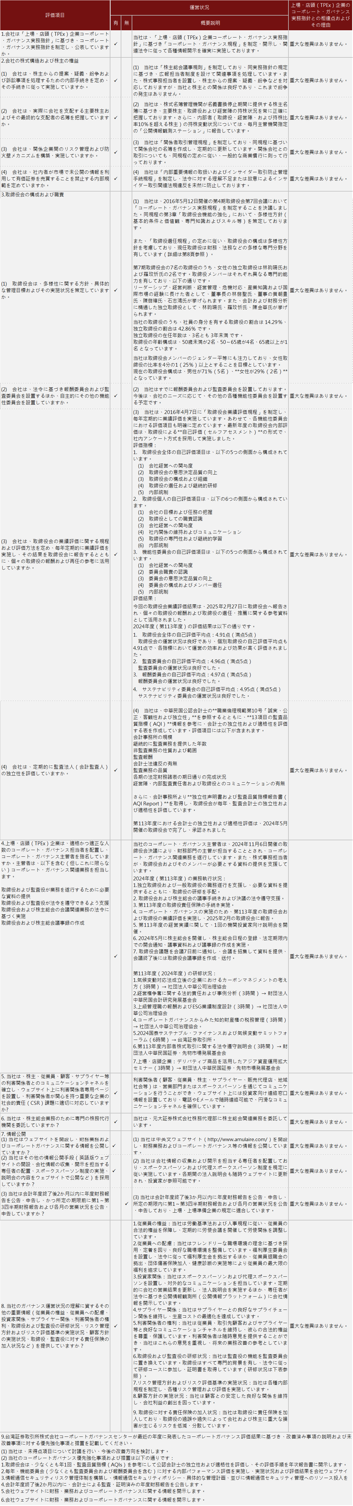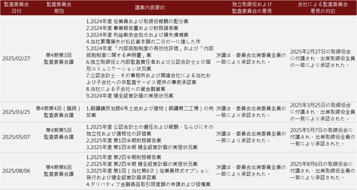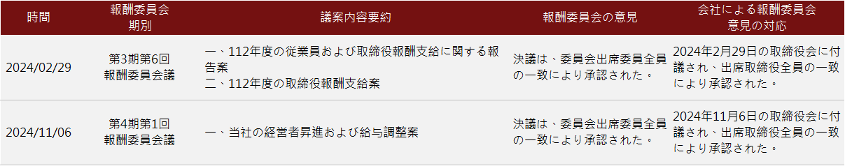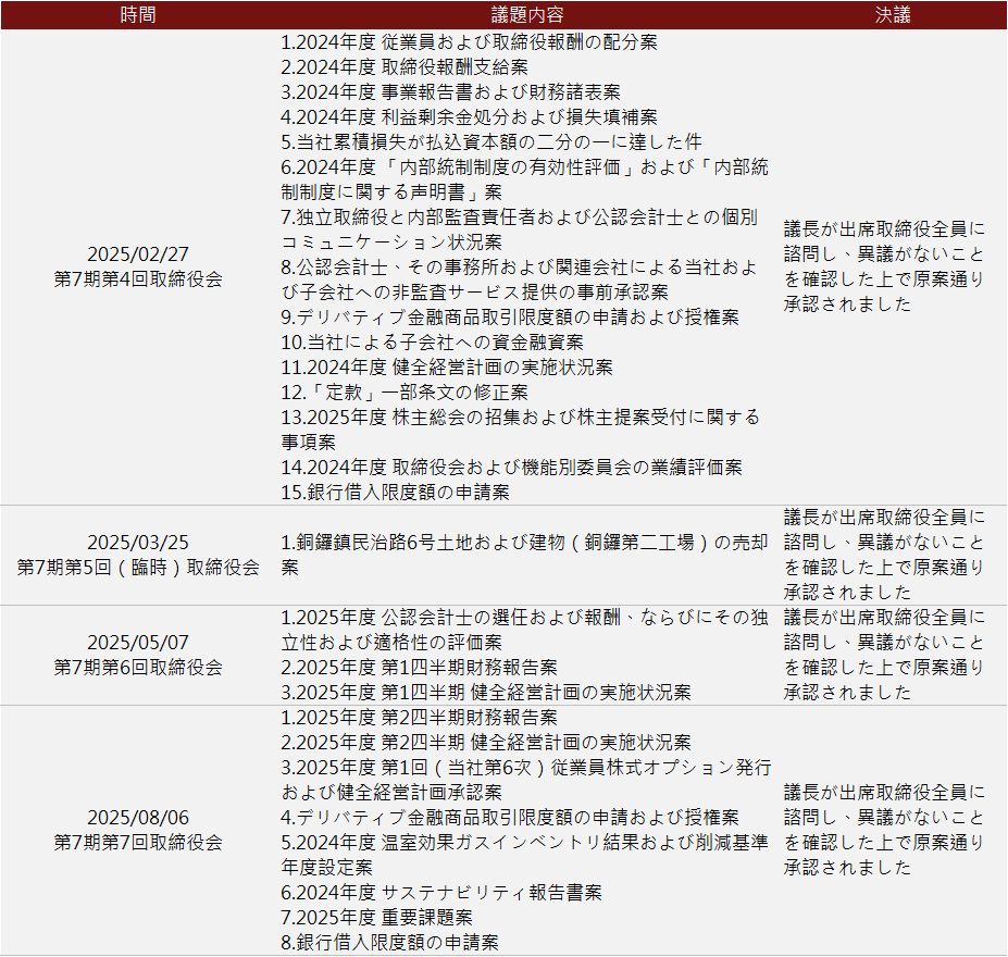 業(yè)績評価結(jié)果は2025年2月27日に取締役會へ提出されました。取締役會および取締役メンバーの業(yè)績自己評価結(jié)果:全體平均は4.91でした。各取締役會および取締役メンバーの測定項(xiàng)目は「良い」から「非常に良い」の間に位置していますが、取締役メンバーと経営チームの相互関係の強(qiáng)化が推奨されます。また、取締役會で財務(wù)の重要な議題がある場合は、証明會計(jì)士を取締役會に招いて専門的な意見を提供してもらい、十分なコミュニケーションと交流の機(jī)會を増やすことが提案されました。すべての項(xiàng)目について、取締役全員が異議なしとの意見を表明しました。