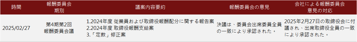 業(yè)績評価結(jié)果は2025年2月27日に取締役會へ提出されました。